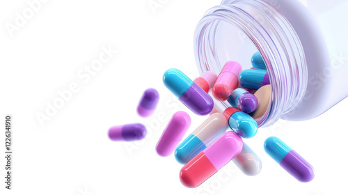 Colorful capsules spill from a white bottle, showcasing a variety of medical supplements. transparent background