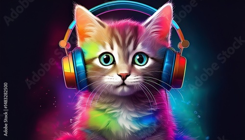 Colorful Cartoon Cat Listening to Music
