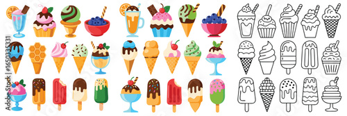 Colorful Cartoon Ice Cream Treats Assortment Cones, Sundaes, Popsicles, and Outline Illustrations