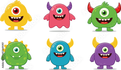 Colorful cartoon monsters set with one eye, horns, big smiles, vector characters for kids designs, fantasy, fun illustration pack