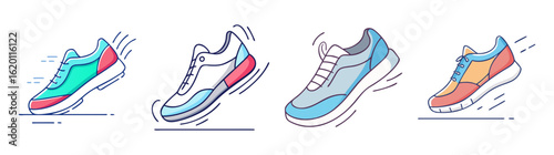 sneaker, shoe, footwear, cartoon, illustration, running, motion, speed, exercise, fitness, active, lifestyle, design, style, colourful, turquoise, red, white, blue, orange, lace, sport, training, athletic, modern, trendy, vibrant, animation, graphic, isolated, minimalist, line art, outline, collection, variety