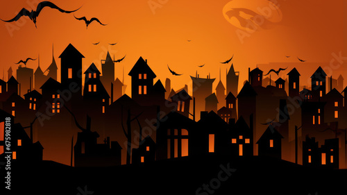 halloween, night, small town, silhouette, colourful, cartoon, modern, orange, bronze, empty space, skittish, haunted, trick or treat, holiday, seasonal, festive, fantasy, whimsical, mysterious, magical, simple, illustration, fantasy art, creepy, autumn, october, city landscape, scarey, ghostly, playful
