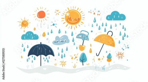 Colorful Cartoon Weather Elements with Sun, Rain, Clouds, and Umbrellas