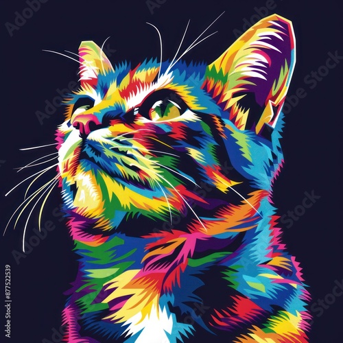 cat, portrait, pop, art, colourful, vibrant, animal, pet, felino, head, closeup, graphic, digital, illustration, design, style, abstract, modern, contemporary, bold, bright, dark, background, blue, yellow, green, red, orange, purple, pink, white, black, eye, ear, nose, whisker, fur, texture, pattern
