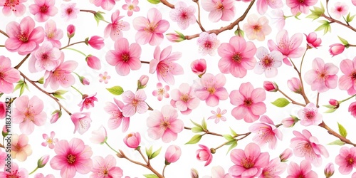 Colorful cherry blossoms in a seamless repeating pattern on a white background, blooming