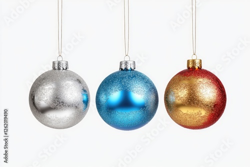 Colorful Christmas baubles hanging together in a trio, showcasing gold, silver, blue, and red. These ornaments can be used for holiday decoration or as a festive accent to a wreath.