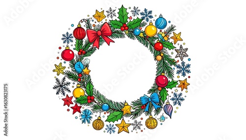 christmas, chaplet, holiday, ornament, decoration, festive, winter, circle, design, colourful, pattern, beautiful, illustration, drawing, celebration, new year, gift, art, decor, symbol, graphic, image, vector, clip art