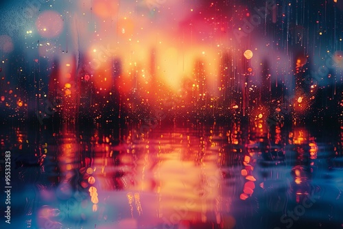 Colorful cityscape with a reflection of the city in the water. Scene is vibrant and lively