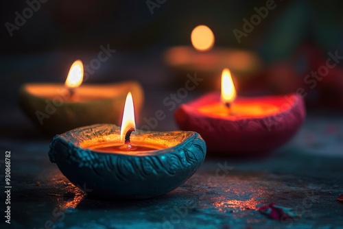 Colorful clay diya lamps lit during diwali celebration with copy space with generative ai