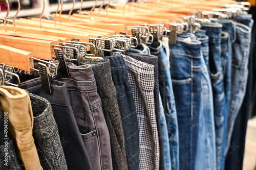 Colorful clothes hanging on a hanger for sale in shop. Clothes hanging on rack in second hand store. Pants for sale in fashion store.