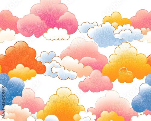 cloud, sky, pattern, seamless, colourful, pastel, design, texture, background, illustration, art, graphic, wallpaper, fabric, textile, print, digital, vibrant, whimsical, happy, dreamy, fluffy, soft, gentle, airy, light, bright, summer, spring, nature, abstract, decorative, ornate, swirl, line, wave, asian, oriental, style, repeat, artwork, image