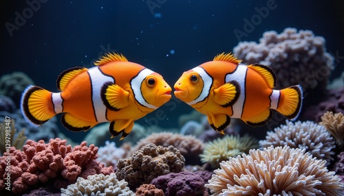 Colorful clownfish interacting in vibrant coral reef, underwater friendship