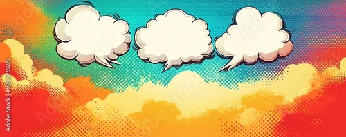 Colorful comic book page with three speech bubbles in vibrant pop art style against a dynamic background