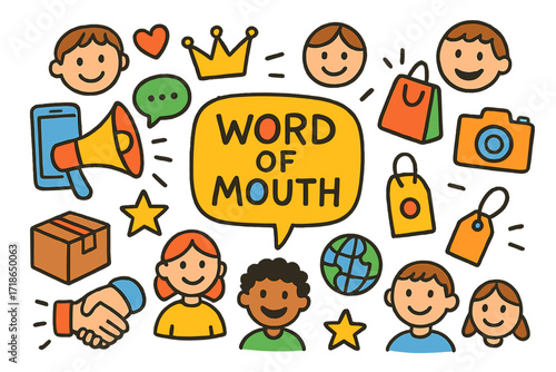 Colorful Communication Icons. Word of mouth. Colorful Hand-drawn doodle Children illustration chat bubble, megaphone, phone, smiling faces, star, crown, heart,