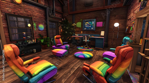 loft, room, colourful, rainbow, seating, chair, circular, hardwood, brick, decorative, element, plant, art, desk, study, cosy, modern, design, home, interior, furniture, decor, living, space, vibrant, pastel, rug, poster, light, window, bookshelf, functional, creative, comfortable, gaming, virtual, three-dimensional, interior design, home decor, relaxation, community, inclusive, bright, fun, unique, pattern