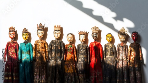 doll, puppet, figure, toy, art, craft, hand-made, antique, vintage, collectable, ethnic, traditional, culture, heritage, royalty, king, queen, crown, costume, clothing, colourful, vibrant, shadow, sunlight, light, white, background, wooden, painted, face, expression, display, row, line, group, collection, object, decorative, ornate, detail, miniature, small, folk, asian, african, global, diversity
