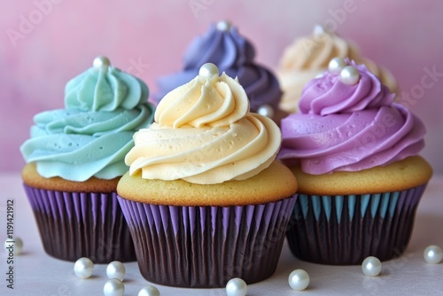Colorful cupcakes with swirled frosting and decorative pearls cr