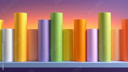 cylinder, pastel, colours, texture, product, display, background, shelf, studio, shot, abstract, design, vibrant, hue, orange, yellow, purple, green, light, shadow, minimal, modern, arrangement, row, colourful, object, image, graphic, illustration