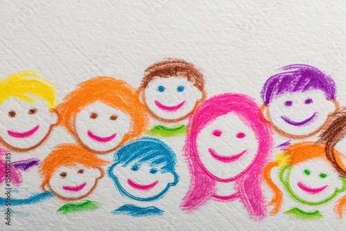 Colorful depiction of a diverse group of smiling cartoon characters with various hairstyles and expressions representing joy friendship and the essence of childhood innocence in art