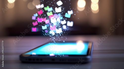 Colorful Digital Icons Emanating from a Smartphone Screen Representing Social Media Connections and Virtual Interactions in a Bright Background