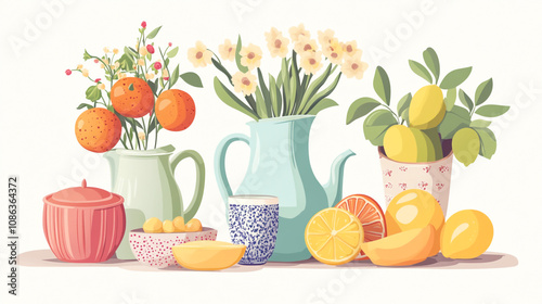 Colorful display of fruits and flowers in ceramic pots on a light background