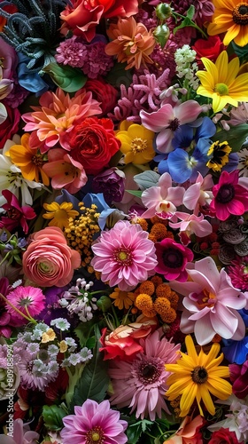 colorful diverse assortment of flowers, showcasing a beautiful array of petals, stems, and leaves