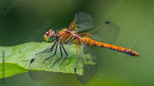 Colorful Dragonfly Resting on Green Leaf