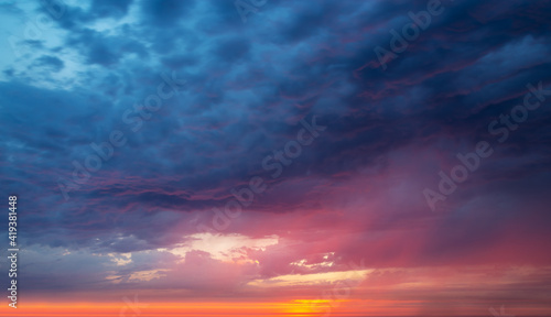 Colorful dramatic dark stomy sky with clouds at sunset, nature background