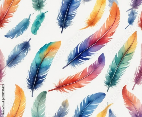 Colorful feather illustrations in watercolor style, clip art, vibrant, feathers, hand-painted, design elements