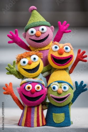 Colorful felt characters with vibrant expressions are joyfully posing together, showcasing their playful designs and unique features in a cheerful arrangement