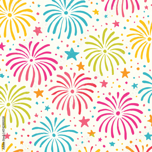 Colorful Fireworks Celebration Pattern With Stars And Confetti For Festive Backgrounds