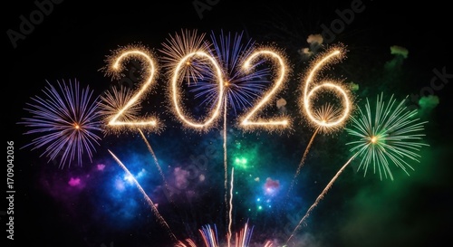 Colorful Fireworks Display Celebrating New Year 2026 with Bright Sparkling Lights