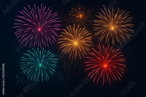 Colorful fireworks explosion in night sky with glowing light trails on dark background, festive celebration concept with graphic style explosion burst.