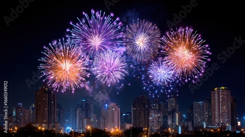 Colorful fireworks light up night sky over vibrant city skyline, celebrating festive occasion with dazzling bursts of purple, pink, and orange hues