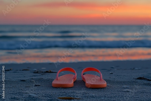 Colorful flip flops resting on sandy beach at sunset with ocean waves in the background