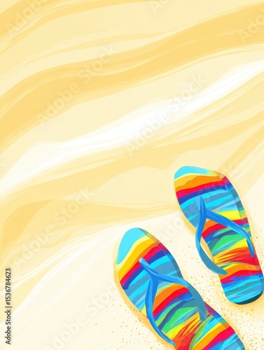 vacation, summer, travel, tour tourism, beach, holiday, relaxation, tropical, leisure, get-away, sand, footwear, colours, freedom, adventure, fun, happiness, carefree, recreation, destination, lifestyle, well-being, season, ocean, coast, sunny, bright, vibrant, cheerful, paradise, escape, journey, explore, discovery, coastline, shore, sandal, rainbow, stripes, pattern, blue, yellow, orange, red, green, water, turquoise