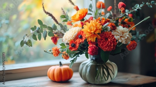 Colorful floral arrangement with seasonal flowers and pumpkin on wooden table by window