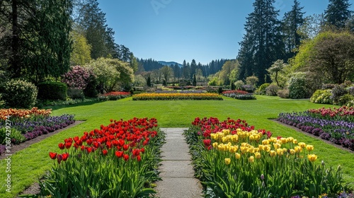 flower, garden, nature, landscape, vibrant, plant, spring, tulip, colourful, blossom, green, sunlight, beauty, park, scenic, view, dirtied, path, calmness, horticulture, flora, planting, gardening, bloom, landmark, bright, peaceful, nurturing, freshness, manicured, design, growth, photo, season, aesthetic, sunshine, relaxation, environment, visual, springtime