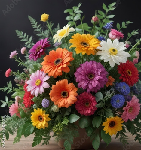 Colorful flower bouquet arrangement with mixed blooms and greenery, greenery, flowers, illustration