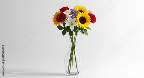 flower, bouquet, sunflower, rose, lily, vase, floral arrangement, stem, leaf, glasses, centrepiece, arranged, isolated, standing, fresh, botanical, studio shot, minimalist, still life, isolated on white, bright, colourful, yellow, red, white, green, purple, vibrant, cheerful, elegant, simple, natural, white background, indoor, studio, decoration, gift, celebration, nature, beauty, floral, romance, love, floristry, home decor, freshness