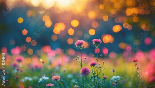 Colorful flowers in a field at sunset with blurred bokeh background. Nature and floral scene. Bright and vibrant.