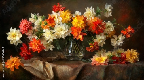 Colorful flowers in a vase are arranged with beauty to form a vibrant and cheerful still life.