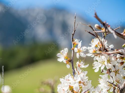 Colorful flowers in spring season in Chichilianne town, countryside of France, under clear blue sky