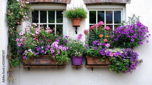 Colorful flowers in window boxes, charming building, summer day, home decor