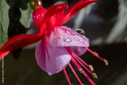 Colorful flowers of fuchsia magellanica flowers in spring garden