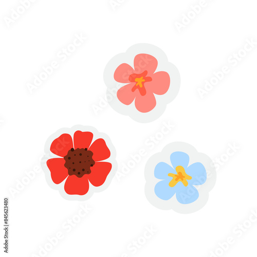 Colorful flowers stickers. Floral decorations, women power cartoon vector illustration