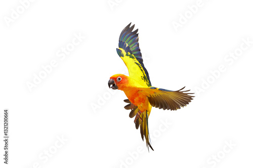 Colorful flying Sun Conure parrot isolated on transparent background png file