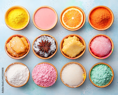 food, ingredient, cooking, baking, colourful, vibrant, topview, overhead, background, texture, pastel, sweet, dessert, sugar, powder, spice, orange, lemon, holi, festival, celebration, bright, delicious, receipe, culinary, kitchen, food photography, healthy eating, diet, epicure, appetising, tasty, breakfast, brunch, snack, treat, learning, digital