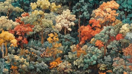 high-coloured, pattern, artwork, painting, blue, background, colourful, dense, red, illustration, yellow, detailed, wood, tree, vibrant, bush, green, nature, design, decorative, scenic, plant, texture, brown, foliage, landscape, orange, leaf, autumn, lush, forest