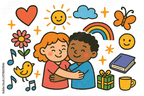 Colorful Friendship Doodles. Colorful Hand-drawn doodle Children illustration Deep Friendship [hugging people, heart, star, rainbow, flower, spark, sun, cloud,